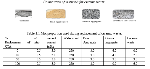 The flow table indicates the whole process which consists of a selection of materials such as cement, fine aggregate coarse aggregate, and waste. Concrete is prepared for M25 grade mix design for plain concrete. Ceramic tile waste was used as partial replacement with coarse aggregate and these were used as floor finishing and wall (S.O. Ajamu, et al 2018) Materials are mixed by considering the proportions as per the mix design. The mold of ddimensions 150 x150 x150 mm in 03 layers with each layer of height approximately 50mm (Priyanka Kusum, Sayed Tabish Quadri 2021). in each layer, compaction is done by using a tamping rod/shake table. the molds were prepared for different proportions as per the design IS:10262-2009. The cubes were cured for 7&28 days of curing period and the concrete were