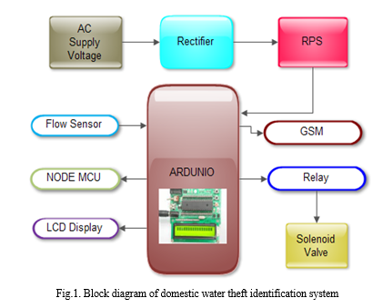 The experimental setup is made and tested in the Electronics Laboratory at Dhirajlal Gandhi College of Technology. The 230V AC supply is given to the rectifier circuit and it will convert the DC supply. The regulated 12V supply is given to the ARDUINO UNO board and it will derive the board. The block diagram of the domestic water supply theft identification system is shown in Fig. 1. In this setup consists of a PIC, flow sensor, Node MCU, relay, and GSM module. The Node MCU is an employed development board in IoT applications; it provides a versatile and cost-effective approach to connect devices to online monitoring. All the data collected from ARDUINO is connected with a NodeMCU unit and it process continuously and push data on cloud. The ARDUINO is a microcontroller board based on the ATMEGA328, it is an 8 bit microcontroller has 14 digital input and output pins. The water flow sensor is made up of a plastic valve body with a rotor it uses a pinwheel sensor to measure how much water or liquids has moved through it and water flows through the rotor rolls also speed changes which outputs the corresponding pulse signal. Flow rate measured in Liters/sec/min/hour. By counting the number of pulses from the output of the sensor, can effortlessly track water movement.