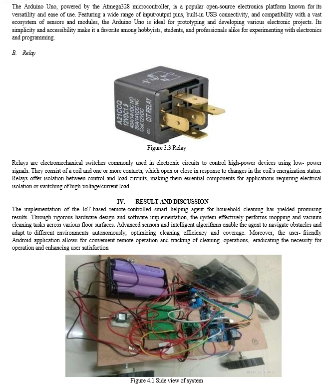 The development of IoT-based remote-controlled smart helping agents for mopping and vacuum cleaning, connected with Bluetooth devices in Android sets, has achieved significant attention in recent literature. Li et al. (2015) provide a comprehensive survey of IoT technologies, highlighting their applications in smart home systems, including automated cleaning tasks. Al-Fuqaha et al. (2015) offer insights into enabling technologies and protocols crucial for the implementation of such systems, emphasizing their potential to enhance efficiency and convenience in household chores. Chen and Chen (2019) delve into the formulation and implementation of remote control systems using Bluetooth and Android, laying the groundwork for the integration of smartphone- based control in cleaning devices. Mukherjee et al. (2021) present a practical approach to IoT-based home automation using Android and Arduino, demonstrating the feasibility of smartphone-controlled cleaning agents. Lee and Jung (2019) contribute by showcasing the development of an IoT-based home monitoring and control system, providing valuable insights into hardware and software integration for remote control functionalities. These studies collectively underscore the growing interest and progress in IoT-based solutions for household cleaning, particularly in leveraging smartphone connectivity and remote control capabilities to enhance user experience and efficiency.