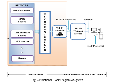 The system's functional block diagram is displayed in Fig.2. The system is intended to receive multiple inputs from sensors that measure physiological parameters of the human body, such as a temperature sensor to measure body temperature, an accelerometer to detect body position, muscle movement, and motion, a SPO2 sensor to monitor blood oxygen level and heart rate, and a galvanic skin response sensor to measure skin response. The microcontroller integrates and processes the sensor inputs before sending the processed data to a Wi-Fi IoT device. With the assistance of an internet coordinator, the IoT device forwards data received from the microcontroller to the end device, which is a computer. At this point, we are able to monitor all the parameters on the IOT platform that is operating on the end device. The coordinator, which might be a modem or Wi-Fi mobile, serves as a router. Data on the IoT platform (Thinger.io) is automatically updated as the sensor node is linked to the host computer. Because of the modular design, adding more sensors to measure and track different characteristics is a fairly simple and straightforward process.