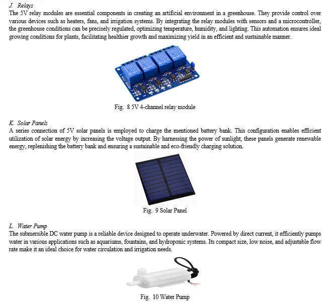The flame sensor detects any potential fire hazards, ensuring the safety of the greenhouse, and the DHT11 sensor measures temperature and humidity for precise climate control. The integration of Arduino Uno and NodeMCU facilitates the seamless communication and coordination among the sensors and actuators. Arduino Uno serves as the main microcontroller, responsible for collecting sensor data, analyzing it, and controlling the greenhouse environment accordingly. NodeMCU acts as a gateway, enabling wireless connectivity and allowing remote access and monitoring of the greenhouse system.