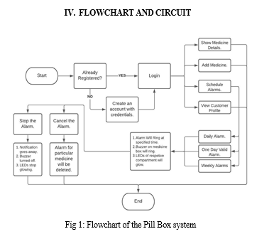 The authors of this paper used an Arduino UNO: embedded system for all-things interface, 8-bit microcontroller RTC sends data to the LCD module, which displays the current time and date on the LCD. Because the RTC module has an inbuilt CMOS cell, it can update the time and date without an external power source. Buzzer: When it's time to take medicines, the buzzer will sound at the appropriate time. LED: There are 7 boxes, and each one has an LED that blinks to indicate which box contains the tablets that should be taken at a particular time. Pushbuttons: This device has three pushbuttons, the first of which is used to set the medication, the second to increment, and the third to move to the next one. When the time and date are set by push buttons, device will continuously compare the real time & set time. An LED will blink and a buzzer will sound if the times are accurate. It then determines if the user has opened the package or not. When the box is opened, the buzzer and LED turn off; otherwise, they continue to sound and blink continuously.. [5]
