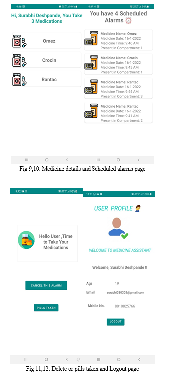 Connect 4 Reds LEDs, Buzzer ,1 Green LED to the digital pins of the Node MCU. In Arduino IDE, install the libraries ESP8266Wifi(connect Node MCU to WIFI Network) , FirebaseESP8266(Connects Node MCU to Firebase Realtime Database) and initialize the variables like, database URL, auth code, password ,SSID of WIFI network, firebase data variable. Use the getInt function to retrieve data of the database field using the given path. Based upon the value of the retrieve data, set the Led and Buzzer Status. The status of LEDs and Buzzer is controlled by the mobile application. Upload the code on Node MCU board. Develop a mobile application which allows multiple users to set alarms. The mobile application consists of functionalities of Registration, Login, Dashboard, Add Medicine Page, Medicine Details Page, Schedule Alarms Page, Customer Profile Page, etc. When an alarm is scheduled , LED attached to particular box is ON and buzzer starts ringing. When the user clicks on the notification received , he/she is directed to notification page. The user needs to take the pills and click on the pills taken button in the Notification to stop the alarm and LEDS.