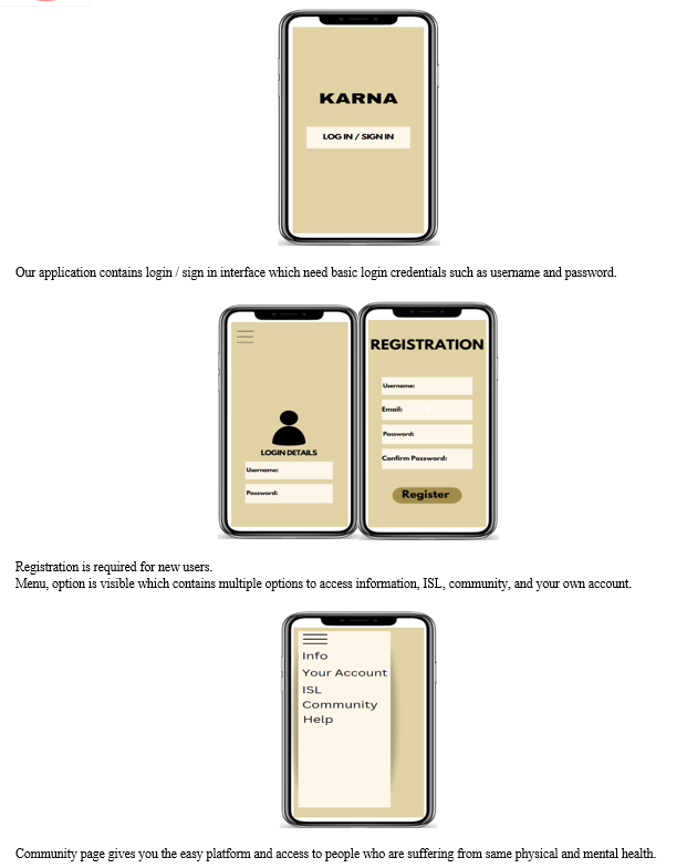 This application provides various features like sign language guide , community for experience sharing , user friendly login interface , menu to track progress at one place. This application will definitely make an effort to make their lives easier with a joyful and fun experience for infants/toddlers.