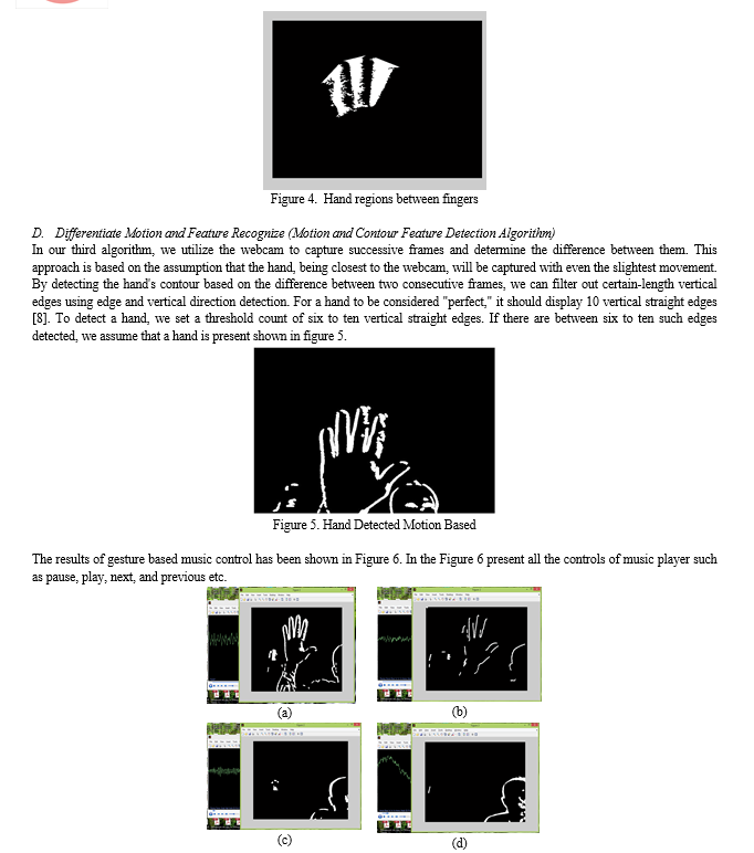 To achieve optimal performance and precision, three hand detection algorithms were designed and evaluated individually. The primary objective of these algorithms was to enable the detection, recognition, and interpretation of hand gestures for triggering specific events, such as controlling a media player. The real-time hand detection algorithm was optimized for efficiency and rapid response to ensure seamless control of the music player using hand gestures. The hand gestures were captured in 3D using multiple cameras, enabling precise detection of gestures in real-time. However, detecting gestures represented by partially occluded hands proved to be more challenging. To control various aspects of the media player, such as music volume, playback control (previous, next, play, pause), and video zoom, a method for detecting such gestures would need to be developed. This would require careful consideration of various factors, including the degree of occlusion and the complexity of the gesture. Nonetheless, the development of such a method would enhance the overall user experience, enabling seamless control of the media player using hand gestures. A. Conflicts of Interest There is no conflict of interest between authors. B. Funding Statement NA C. Acknowledgments I present my gratitude to my supervisor and organisation for continuous support throughout the work