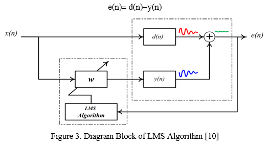 LMS algorithm was developed by Widrow and Hoff in 1959 as an adaptive filter which can be used for noise reduction. Fig. 3 shows a diagram of the LMS algorithm. The parameters d(n) and x(n) are the inputs of the algorithm in the form of column vector. In this d(n) is the desired signal which is the noise corrupted signal and x(n) is the noise signal. The parameter W(n) is the column weight vector of the filter at nth time, which is used in the algorithm to update the subsequent column weight vector