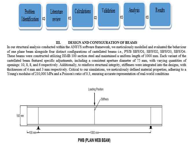 The concept of castellated beams has evolved significantly since its inception during the Industrial Revolution, driven by the need for more efficient and economical structural systems. Castellated beams are created by cutting slots along the web of an I-beam and welding additional steel plates, which increases their load-bearing capacity without significantly adding weight. This design innovation has proven invaluable in modern construction, addressing complex architectural and engineering challenges. Recent advancements in manufacturing technologies, such as computer-controlled cutting and welding, have further refined the production of castellated beams, enhancing their precision and expanding their applicability. These beams are widely utilized in contemporary construction projects due to their material efficiency and the ability to integrate utilities within their structure, thus optimizing space and reducing costs. In contemporary construction, castellated beams are favoured for their ability to span large distances with minimal material usage, thus optimizing both cost and structural performance. The integration of web openings allows for the passage of utilities such as electrical conduits, plumbing, and HVAC systems, further enhancing their utility in modern building designs. This paper investigates the structural behaviour of castellated steel beams using a combination of finite element analysis (FEA) and software investigation. The primary focus is on understanding how web openings influence the beams' deflection patterns. A key aspect of this research is the evaluation of beams with and without stiffeners around the web openings. Stiffeners are additional steel plates welded around the openings to enhance the beam's strength and reduce deflection. The study aims to determine the effectiveness of these stiffeners in improving the structural integrity of castellated beams. Through detailed modelling and simulation using ANSYS software, this study examines both unreinforced and reinforced beams, specifically evaluating the impact of stiffeners around the openings. The findings from this research provide critical insights into the optimization of castellated beam designs, balancing material usage with structural integrity. This study aims to contribute to the broader field of structural engineering by offering innovative solutions for enhancing the performance and efficiency of steel beams in various construction applications.