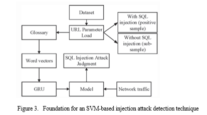 Regular expressions; hashing the text that has been matched; SVM is used to model the acquired data in order to develop a model for identifying SQL injection attacks [14]. The SQL injection attack detection technique is created using the SVM algorithm, and the framework diagram of the method is displayed in Figure 3.