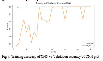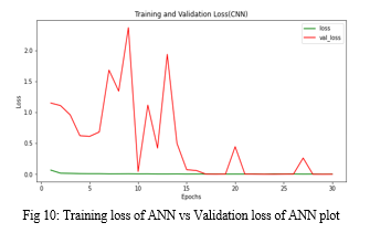 3. 1D Convolutional neural network (CNN): Next model that is implemented is CNN, The Convolutional neural network accuracy (validation vs training) yielded a training accuracy of the 98.2% vs validation accuracy of 98.4% with the loss of 0.18 loss for training and 0.16 loss for validation for 30 epochs at initial stage. training accuracy and validation accuracy with their loss of CNN is plotted in figure 9 and 10 respectively.