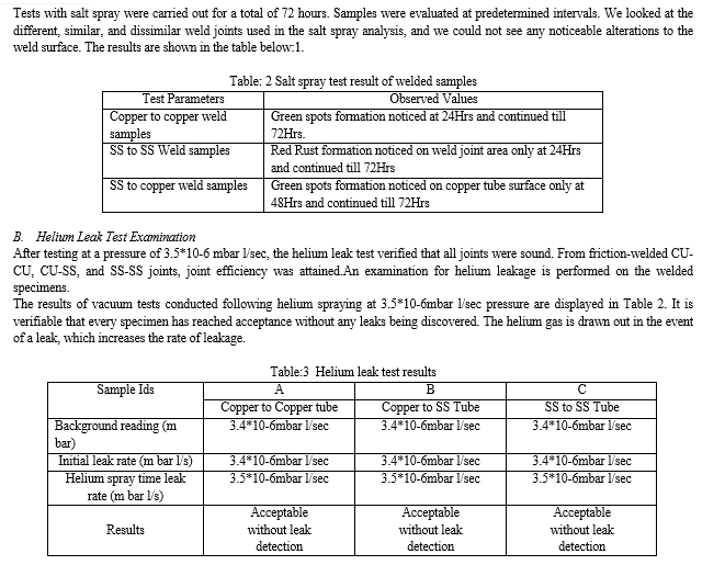 Copper and austenitic stainless steel have been successfully joined using friction welding. Rotational speeds of 1000 revolutions per minute were used to vary the tensile strength values on joints. The bond strengths were similar to those of the copper parent material. The joints that were obtained had good strength and reasonable ductility in copper. The experiment found that copper tubes and austenite stainless steel are useful welding materials. Compared to copper tubes, austenite stainless steel is a more noble metal and a good corrosion-resistant material. The microstructural examination of the SS-SS, CU-CU, and CU-SS tube junctions revealed excellent material flow and weld quality. Furthermore, there were no flaws in the weld zone. While no discernible microstructure changes are seen at the SS side, there are noticeable microstructure changes at the Cu side close to the Cu-SS weld interface. Full dynamic recrystallization zone and partial dynamic recrystallization zone are the names given to the microstructures on the Cu side. Friction welding can be used to join various metals together, but for the process to work well, the parameters between friction time and frictional pressure must be determined. Friction welding has been successfully used to join the dissimilar materials of CU-CU, CU-SS, and SS-SS tube junctions, resulting in defect-free and leak-proof joints that can function in 3.5*10-6mbar l/sec refrigerators and air conditioners.