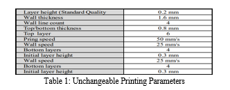 The same design of the specimen was printed with printing pattern of diagonal lines and infill percentage 100%, using the selected four materials i.e., PLA (Polylactic Acid), ABS (Acrylonitrile Butadiene Styrene), PETG (polyethylene terephthalate glycol) and FR-ABS (Flame-Retardant Acrylonitrile Butadiene Styrene).