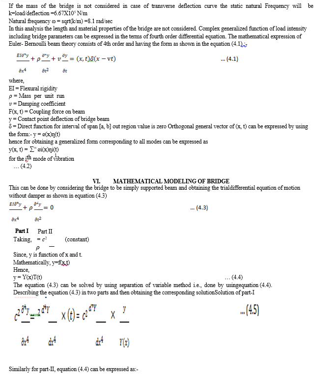The first mathematical expressions were developed in the late 1990’s carrying out many experiments by C. E. Inglis for Tracks considering simply supported segments of a continuous system and S. Timoshenko for bridge super structures. In both of the cases the bridge is the integrated system of simply supported segments containing a lumped vehicle mass. The experiments of 1950’s were also lab dependent until the 1970’s. At that time computer was available for designing and simulating the bridge parameters. Dynamic analysis was firstly carried out in 1953 by K. H. Kinnier. After the year 1980’s standard composite materials like Portland cement, ceramics and RCC were being used extensively in place of steel bridges which were providing flexibility with complexity in material property and geometry. The advancement of new mathematical expression using Laplace and Newmark beta function provides accurate results of damped frequency and damping co-efficient for either side of the vehicle at each point of the bridge using Delta function.