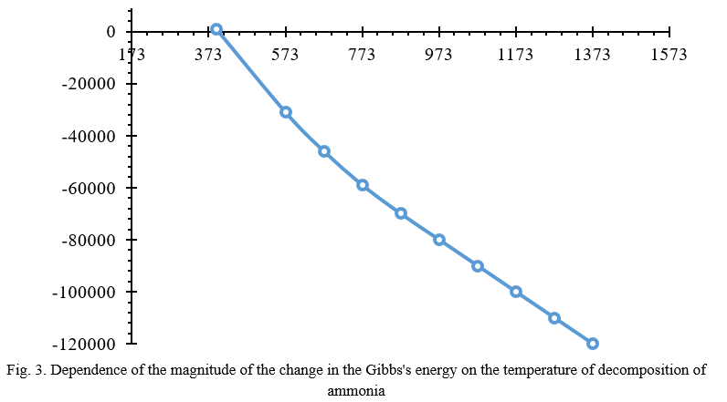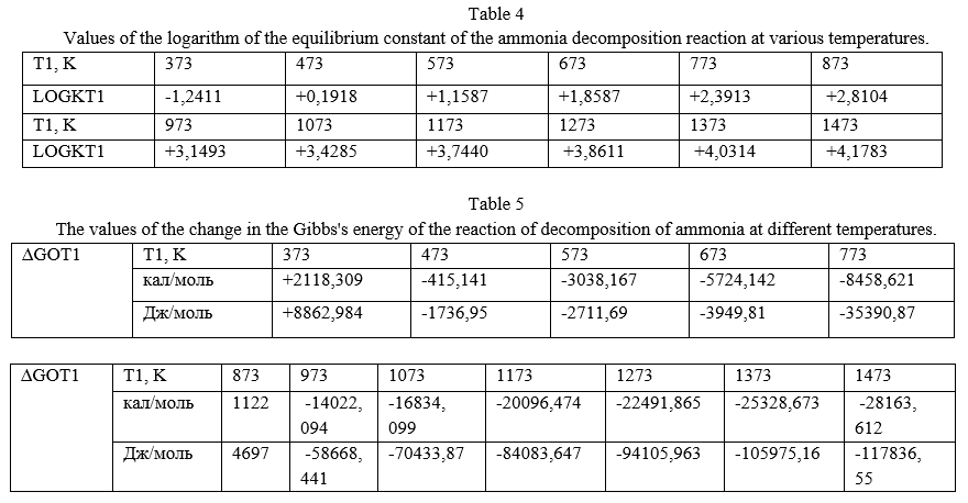 Based on the methodology used,thermodynamic calculations were carried out on the basis of the old constants. According to the old physicochemical constants, the temperature of the onset of ammonia decomposition turned out to be 456K, and according to the new ones, it was 459K [119, p. 6].