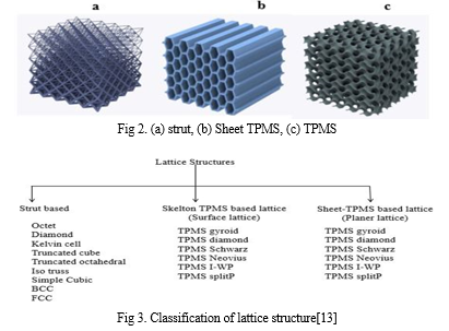 Lattice structures are classified in three categories, such as Strut based, TPMS based and Sheet TPMS based shown in figure 2. Strut based or beam based structure are preferable for lightweight, excellent damage tolerance and energy absorption. TPMS unit cell are favourable for structures with large surface area, high stiffness, and excellent manufacturability. Sheet TPMS are preferable for planar lattice structures or rib grids with the highest directional stiffness. These three types of structure have some more classification which is shown in figure 3.[12,13]