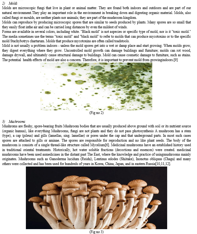 In essence, fungi are plants without the green pigment chlorophyll. Now that this idea has been significantly modified, fungi are classified as a separate kingdom like plants and animals. Fungi are the subject of mycology. Fungi and specific bacteria work together to recycle, or change dead material into a form that is helpful to the earth. By creating mycorrhizal associations, fungi are crucial for the growth of most plants, including crops, but they also cause diseases in humans, animals, and other plant and animal life. Humans eat edible mushrooms because they have one nutritional benefit. [1] There are thought to be 140 000 different species of mushrooms on the planet, just 10% of which are known. Of the roughly 14,000 species that we are now aware of, over 50% are thought to have varied degrees of edibility, more than 2,000 are deemed safe, and about 700 species are thought to have substantial pharmacological capabilities.[2,3,4,5]. There are three different types of fungus: yeasts, mold and mushrooms. Yeast is composed of individual cells, and grows by budding examples; Candida albican, Cryptococcus, Histoplasma and Saccharomyces etc. Candida albicans is oval yeast with a single bud (Figure 1). Four large varieties of unicellular fungi are referred to in the word 'yeasty'.[1,7,8].