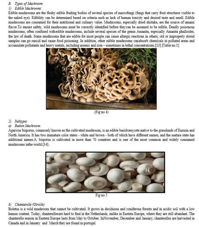 The fungal species known as "wild mushrooms" are those that grow consistently in untamed landscapes and under harsh climatic circumstances. Wild edible species are increasingly widely grown due to their safe and nutritious qualities, especially once their nutritional qualities have been found and documented. For instance, the Cantharellus cibarius wild edible mushroom, which is primarily found in Antalya (Turkey), is renowned for its strong total antioxidant status (TAS), total oxidant status (TOS), and oxidative stress index (OSI), which are measured by the DPPH scavenging activity. One of the most popular wild mushrooms is called Termitomyces heimii, which is grown in sub-Saharan Africa and has therapeutic qualities that are comparable to those of meat and fish. This fresh mushroom's flour was found to include a high amount of proteins, lipids, moisture, ash, and carbohydrates. T. heimii was recommended for eating because of its high protein and low fat content (3.58%), as well as its favorable foaming qualities and other crucial functional qualities, which make it an ideal ingredient in the food industry[37,38,39]