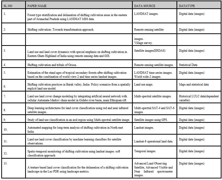The Government of India is working on a project to study areas under shifting cultivation. Through this project we get an opportunity to contribute to their efforts. While working on this project an individual gets an exposure to open source technologies, used to collect satellite images. Much research has been conducted on this topic. Still it was observed that the remote sensing mapping is unable to provide correct data, as it doesn't reach the root cause of shifting cultivation[13]. Government is expecting organizations to look for all of these issues. Through this project a person gets knowledge of various ML algorithms for image classification, we can also see few scientists have integrated ML algorithms to get the result. ISRO organization has also worked on this. Thus they have built a few websites through which a person can get related data for the project. Bhuvan is used for data collection and Vedas for data analysis. Through these sources a student can carry forward the project.