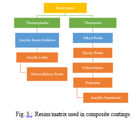 Resins are polymeric materials that are used in coatings to make useful films after being coated. A high MW resin is required for effective film formation. Resins used in coatings are mostly two types thermoplastic resin and thermosetting resin. Thermoplastic resins are those resins that have low molecular weight and they need chemical reactions or curing agents to increase their molecular weight and to the formation of the film after application of coatings, and thermosetting resins are those resins that have very high molecular weight and that form uniform films without using a curing agent and no need of chemical reaction [14]. Fig. 3 indicates Resins/matrix used in composite Coatings.