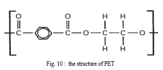 Fig. 10 indicates the structure of PET [33]. Polyester fibers account for approximately 63.5 percent of global PET output.[34].The commercial methods of dimethyl terephthalate (DMT) and terephthalic acid (TPA) are used to make PET [35]. Poly (ethylene terephthalate) is a thermoplastic, semi-crystalline, and linear polymer that belongs to the polyester family. A chemical molecule is distinguished by its repeated ester groups.PET is typically made by a poly-condensation (step-growth) process at temperatures between 240 and 260 °C and pressures between 300 and 500 kPa, ethylene glycol (EG) combines with terephthalic acid, producing water[34].