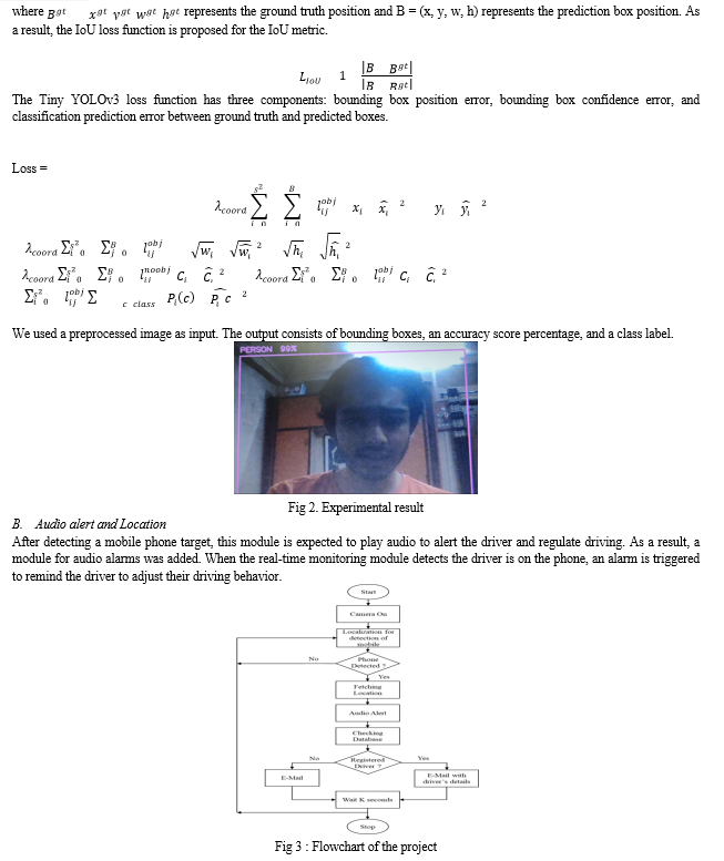 [1] P. Adarsh, P. Rathi and M. Kumar, \"YOLO v3-Tiny: Object Detection and Recognition using one stage improved model,\" 2020 6th International Conference on Advanced Computing and Communication Systems (ICACCS), 2020, pp. 687-694, doi: 10.1109/ICACCS48705.2020.9074315. [2] C. Liu, Y. Tao, J. Liang, K. Li and Y. Chen, \"Object Detection Based on YOLO Network,\" 2018 IEEE 4th Information Technology and Mechatronics Engineering Conference (ITOEC), 2018, pp. 799-803, doi: 10.1109/ITOEC.2018.8740604. [3] R. L. Galvez, A. A. Bandala, E. P. Dadios, R. R. P. Vicerra and J. M. Z. Maningo, \"Object Detection Using Convolutional Neural Networks,\" TENCON 2018 - 2018 IEEE Region 10 Conference, 2018, pp. 2023-2027, doi: 10.1109/TENCON.2018.8650517. [4] W. Boyuan and W. Muqing, \"Study on Pedestrian Detection Based on an Improved YOLOv4 Algorithm,\" 2020 IEEE 6th International Conference on Computer and Communications (ICCC), 2020, pp. 1198-1202, doi: 10.1109/ICCC51575.2020.9344983. [5] Lin, TY. et al. (2014). Microsoft COCO: Common Objects in Context. In: Fleet, D., Pajdla, T., Schiele, B., Tuytelaars, T. (eds) Computer Vision – ECCV 2014. ECCV 2014. Lecture Notes in Computer Science, vol 8693. Springer, Cham. https://doi.org/10.1007/978-3-319-10602-1_48 [6] M. B. Abbas and M. Khan, \"Sentiment Analysis for Automated Email Response System,\" 2019 International Conference on Communication Technologies (ComTech), 2019, pp. 65-70, doi: 10.1109/COMTECH.2019.8737827. [7] R. Kumari and C. Fancy, \"Analyzing the PyGameGUI modules available in python,\" 2017 International Conference on IoT and Application (ICIOT), 2017, pp. 1-6, doi: 10.1109/ICIOTA.2017.8073603. [8] M. Khan, S. Chakraborty, R. Astya and S. Khepra, \"Face Detection and Recognition Using OpenCV,\" 2019 International Conference on Computing, Communication, and Intelligent Systems (ICCCIS), 2019, pp. 116-119, doi: 10.1109/ICCCIS48478.2019.8974493. [9] L. Tianjiao and B. Hong, \"A optimized YOLO method for object detection,\" 2020 16th International Conference on Computational Intelligence and Security (CIS), 2020, pp. 30-34, doi: 10.1109/CIS52066.2020.00015. [10] Yordanov, B. E. \"Car Drivers\' Monitoring by Means of Mobile Phone Application.\" Bachelor\'s thesis, University of Twente, 2019. [11] Bagade, Abhay P. \"Cell phone usage while driving avoidance with GSM-RF based accident emergency alert system.\" Int. J. Adv. Res. Comput. Commun. Eng 2, no. 5 (2014) [12] Wang, Dan, Mingtao Pei, and Lan Zhu. \"Detecting driver use of mobile phone based on in-car camera.\" In 2014 Tenth International Conference on Computational Intelligence and Security, pp. 148-151. IEEE, 2014. [13] A. P. Jana, A. Biswas and Mohana, \"YOLO based Detection and Classification of Objects in video records,\" 2018 3rd IEEE International Conference on Recent Trends in Electronics, Information & Communication Technology (RTEICT), 2018, pp. 2448-2452, doi: 10.1109/RTEICT42901.2018.9012375. [14] Ali, Haimd M., and Zainab S. Alwan. Car accident detection and notification system using smartphone. Saarbrucken: LAP LAMBERT Academic Publishing, 2017. [15] Seshadri, Keshav, Felix Juefei-Xu, Dipan K. Pal, Marios Savvides, and Craig P. Thor. \"Driver cell phone usage detection on strategic highway research program (SHRP2) face view videos.\" In Proceedings of the IEEE Conference on Computer Vision and Pattern Recognition Workshops, pp. 35-43. 2015. [16] Hou, J. H., Xiaofeng Xie, Qian Cai, Zhengjie Deng, Houqun Yang, Hongnian Huang, Xun Wang, Lei Feng, and Yizhen Wang. \"Early warning system for drivers’ phone usage with deep learning network.\" EURASIP Journal on Wireless Communications and Networking 2022, no. 1 (2022): 1-11 [17] Ishida, Toshiro, and Tsuneo Matsuura. \"The effect of cellular phone use on driving performance.\" IATSS research 25, no. 2 (2001): 6-14. [18] Khurana, Rushil, and Mayank Goel. \"Eyes on the road: Detecting phone usage by drivers using on-device cameras.\" In Proceedings of the 2020 CHI Conference on Human Factors in Computing Systems, pp. 1-11. 2020. [19] Mendez, Efrain, Alexandro Ortiz, Pedro Ponce, Juan Acosta, and Arturo Molina. \"Mobile phone usage detection by ann trained with a metaheuristic algorithm.\" Sensors 19, no. 14 (2019): 3110 [20] Woo, Yew Meng. \"Vision-based Detection of Mobile Device Use While Driving.\" PhD diss., Curtin University, 2019. [21] Ameya Kokate, Ayush Sinha, Dhesikan Chellappa, Hemant Bhatt, Wasim Sayyed, B.R. Quazi “Automatic Rash Driving Detection and Reporting Using Smartphones”. Student Department of Computer Engineering, AISSMS College of Engineering, Shivajinagar, Pune. [22] Jie Yang , Simon Sidhom , Gayathri Chandrasekaran, Tam Vu , Hongbo Liu, Nicolae Cecan , Yingying Chen , Marco Gruteser , Richard P. Martin “Detecting Driver Phone Use Leveraging Car Speakers”, Stevens Institute of Technology, Hoboken, USA [23] J. Redmon, S. Divvala, R. Girshick and A. Farhadi, \"You Only Look Once: Unified, Real-Time Object Detection,\" 2016 IEEE Conference on Computer Vision and Pattern Recognition (CVPR), 2016, pp. 779-788, doi: 10.1109/CVPR.2016.91. [24] M. Michalko, J. Onuška, A. Lavrín, D. Cymbalák, O. Kainz, \"Tracking the Object Features in Video Based on OpenCV\", Technical University of Košice/FEEI/Department of Computers and Informatics, Slovakia. [25] Ortega, Carlos A. Catalina, Miguel A. Mariscal, Wafa Boulagouas, Sixto Herrera, Juan M. Espinosa, and Susana García-Herrero. \"Effects of mobile phone use on driving performance: an experimental study of workload and traffic violations.\" International journal of environmental research and public health 18, no. 13 (2021): [26] X. Li and Y. Shi, \"Computer Vision Imaging Based on Artificial Intelligence,\" 2018 International Conference on Virtual Reality and Intelligent Systems (ICVRIS), 2018, pp. 22-25, doi: 10.1109/ICVRIS.2018.00014 [27] Jaswanth Reddy Rekkala, \"Mobile usage detection of driver Using CNN (Convolutional Neural Network)\", CALIFORNIA STATE U