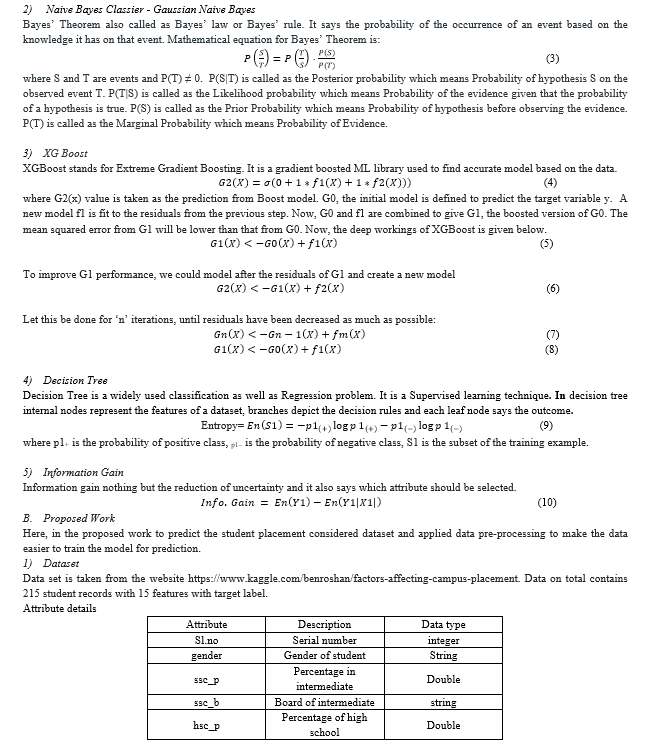 Sultana et al.[1] worked on training and modelling of a data set and created a better prediction model with better accuracy rate. They worked on ConvolutionalNeuralNetwork (CNN). They proved that CNN achieves a better accuracy than other traditional methods of accuracy 97.55%. Mondal et al.[2] used Recurrent Neural Network (RNN) to predict the students performance. Their analysis made the faculty to identify the students who are in danger zone and based on that they can give better solution to their problem. They also made the comparison among Artificial Neural Network and Deep Neural Network of accuracy 85.4%. Ramesh et al.[3] presents an approach by using Deep Learning algorithms to create a new placement prediction method for all graduates. Manvitha et al.[4] used to compare their proposed method with some of the traditional classification algorithms like Random forest, Decision tree with respect to precision, accuracy. They also proved that their proposed method performs better in comparison with other traditional classification algorithms for decision tree accuracy is 84% and for random forest accuracy is 86%. Kavipriya et al.[5] worked on new classifier called as Adaptive weight Deep Conventional Neural Network(AWDCNN) which is optimized with the help of Genetic algorithm to predict the student performance. They proved that proposed classifier AWDCNN produces better results than existing prediction methods with the help of training data set of accuracy 92.41%.D. Satish Kumar et al.[6] have conducted the Study on placement prediction they have randomly taken a 250 MBA students records from 5 leading institutions and six-predictor logistic regression model was used for this data they have taken various parameters like CGPA in UG and PG, Specialization in UG and PG, Soft skill score and gender and they have diagnostic the record before applying of Logistic Regression and they measured their accuracy by using Confusion matrix and finally came up with a conclusion Hosmer-Lemeshow Goodness-of-Fit test conforms that the model is best fit for their dataset and based on ROC model it gets accuracy 60%. Irene Treesa Jose et al.[7] have studied the student placement prediction they are used several Machine learning (ML) techniques such as K-nearest neighbor (KNN) , Support Vector Machine (SVM), Logistic Regression(LR), Random Forest(RF) and they tested the performance accuracy of various machine learning algorithms and try to compare the accuracy of machine learning algorithms. They have taken a dataset which consists of various parameters like Quantitative scores, Logical Reasoning scores, Verbal scores, Programming scores, CGPA, No. of hackathons attended, No. of certifications, current backlogs they have test on these parameters and they have mentioned about the detailed description of each of these algorithms. Shreyas Harinath et al.[8] have conduct the study of placement status of the student’s prediction is done by using Naïve Bayes, K-nearest neighbor they used the past data of scholars and used to train the model for rule identification and testing the model for classification. They consider the parameters like USN, Tenth and PUC/Diploma results , CGPA, Technical and Aptitude Skills for their prediction. The Naïve Bayes classifier is very effective on many real data applications and the KNN is work on similarity measures and the accuracy of KNN is 95.18%, for Logistic regression 97.59%, for Random forest 96.38%, and for SVM accuracy is 100%. Krishnanshu Agarwal et al.[9] had implemented various data mining techniques for student placement prediction and they have used algorithms like K-nearest neighbor(KNN) which is used to labeled points to learn to label other points and random forest(RF) which works by creating a group of random uncorrelated decision trees(DT) and increase the accuracy by taking grade point average(GPA), cumulative grade point average(CGPA) as in their dataset from final year students of B.tech from Kalinga Institute of Industrial Technology(KIIT). Their analysis gives that KNN gives 93.54% and random forest gives the 83.87% accuracy and they have concluded that KNN gives more accuracy for their dataset. Abhishek S. Rao et al.[10] have conducted a detail study of placement prediction and Educational data mining (EDM) in the field of machine learning and data mining to analyze the data for prediction the data is collected from different institutions and they used different factors like CGPA attained, certifications courses completed and they used machine learning algorithms like KNN(K-nearest neighbor), SVM(support vector machine), and ANN(Artificial neural network) and they have measures the performance metrics such as accuracy precision, sensitivity, F1-score and Area under ROC curve(AUC).