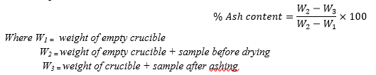 About 1.0g of the sample (kola nut pod) was weighed into a crucible and put in the muffle furnace set at 550oC and left for about 5 hours The crucible and its content were cooled to about 100oC in air, then room temperature in a desiccator and weighed. This was done in triplicate. The ash content was then calculated as;