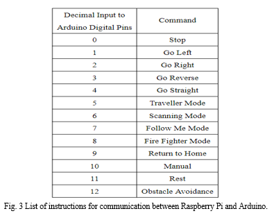 2. High Level Control Layer: The high-level control layer is responsible for visual perception, generating instructions for the low-level control layer, communicating with higher layers, and taking instructions from them. The higher-level control layer consists of Raspberry Pi with a Pi Cam as the camera device and a zig-bee antenna for communication. The relationship between low-level and high-level control layers can be described as a unidirectional master-slave system in which Raspberry Pi can communicate with the Arduino but not the other way around. To establish this method of communication, we connected four GPIO output pins from the RPi to the Arduino digital input pins. This way, we can send a 4-bit binary signal by a very simplified approach, and we can send up to 16 individual instructions.