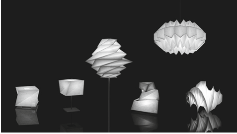 2) Material Application:Different materials can supplement the origami structures, bring completely different functions, and broaden its use scenarios and modes. Functional materials can be used to create unique interactions with origami structure.[1] For example, in the origami luminaire designed by Yael Akirav in the picture below: