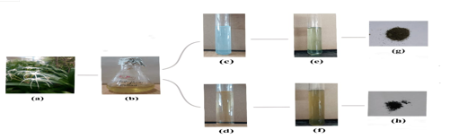 Fig. 1: Various steps involved in the preparation of NPs sample (a) image of the flowers, (b) floral extract (c) 1% CuSO4, (d) 0.01 M FeCl3.6H2O, (e) formation of CuONPs (f) formation of IONPs, (g) finely crushed CuONPs, (h) finely crushed IONPs