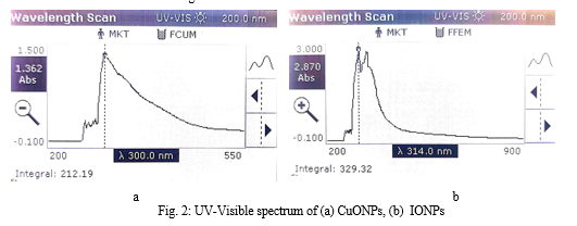UV-Vis analysis is one among the foremost important characterization methods to review nanoparticles. The surface plasmon resonances (SPR) of synthesized oxide nanoparticles have been studied by UV-Vis Spectrophotometer. The absorption of visible radiations because of the excitation of SPR, imparts various colours to nanoparticles. The colour of the solution is also expected to change as the size of the nanoparticles changes. Therefore, the production of nanoparticles is quite sensitive to the UV-Vis absorption spectrum. The two nanoparticle samples were subjected to UV-Vis study. Fig. 2 shows the UV-Vis spectrum of the samples. The highest peak bands of copper oxide nanoparticles was observed around 300 nm and that of iron oxide nanoparticles was around 314 nm. From the various literature studied pure Cu NPs show peaks near 590nm and the peaks for CuONPs are around in the range of 250 nm. As the observed UV result for the synthesised copper particles are nearer to the later, it is assumed that the synthesisied particles predominantly consists of CuONPs. The same goes in the case of IONPs as various literature survey indicates the peak observations of IONPs are in the range between 250-350 nm.