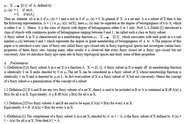 The concept of a fuzzy subset was introduced and studied by L.A.Zadeh in the year 1965. The subsequent research activities in this area and related areas have found applications in many branches of science and engineering. In the year 1965, L.A.Zadeh [1] introduced the concept of fuzzy subset as a generalization of that of an ordinary subset. The introduction of fuzzy subsets paved the way for rapid research work in many areas of mathematical science. In the year 1968, C.L.Chang [2] introduced the concept of fuzzy topological spaces as an application of fuzzy sets to topological spaces . Subsequently several researchers contributed to the development of the theory and applications of fuzzy topology. The theory of fuzzy topological spaces can be regarded as a generalization theory of topological spaces. An ordinary subset A or a set X can be characterized by a function called characteristic function