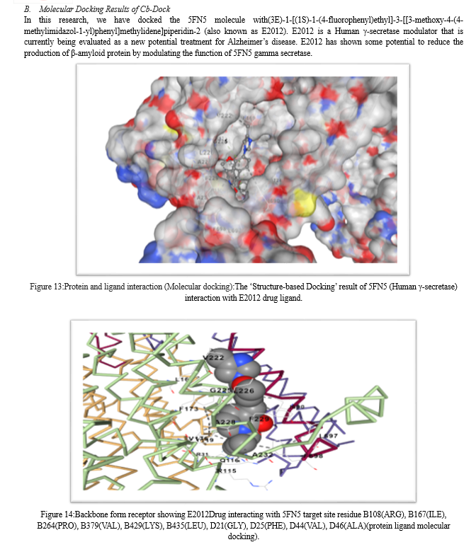 Alzheimer\\\'s disease is a form of dementia characterized by the gradual and irreversible loss of cognitive abilities, primarily affecting memory, thinking, and behaviour.Globally, there are more than 50 million people that suffer from Alzheimer\\\'s.Alzheimer\\\'s disease, a complex and devastating neurodegenerative disorder, represents a profound challenge to modern neuroscience and medicine. Defined by the accumulation of abnormal protein aggregates, such as beta-amyloid plaques and tau tangles, within the brain, it inexorably disrupts essential neuronal connections and communication. This relentless deterioration leads to a gradual deterioration of cognitive functions, memory loss, and ultimately, a profound loss of independence for afflicted individuals. Unravelling the intricate molecular and cellular mechanisms underlying Alzheimer\\\'s remains an urgent scientific endeavour, offering hope for novel treatments and preventive strategies to confront this formidable adversary of the human brain. In this study, the variability of the human ?-secretase, 5FN5protein sequence was compared and evaluated with the reference sequence using MMDB, BLAST, and COBALT. RasMol was utilized to identify the domain and function of the human ? secretase for the analysis of structural properties. Molecular docking was performed to study the interaction of 5FN5 molecule and the associated ligandusing PyMOL. In the computer-aided drug designing approach, molecular docking was performed for 5FN5 protein, and CB-Dock was used to find optimized conformations between 5FN5 protein and E2012 drug, resulting in the minimum energy that bound to a particular protein. E2012 was found to be the accurate drug ligand for the binding site of gamma secretase with docking score of –9, acting as a modulator for 5FN5 protein.