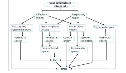 Pathways that connect the noselymphatics, which are essential for CSF circulation and drainage, to the perineural spaces—which include olfactory nerves and the subarachnoid space, which includes CSF—allow access to the CSF and other areas of the brain. Substances secreted by the lateral and fourth ventricles of the four choroid plexi, in particular, cause the generation of CSF. To cushion the brain, the choroid plexi secrete CSF, a secretory fluid [43]. It is reported that tracers injected into the cerebral spinal fluid (CSF) in the subarachnoid space or cerebral ventricles drain into channels that are related to olfactory nerves that traverse the cribriform plate on the underside of the olfactory bulbs. The tracers then travel to the noselymphatic and cervical lymph nodes. system [70–73].As a result, CSF passes between the cribriform plate of the skull, the olfactory submucosa, and the olfactory axon bundles and the nosecavity's roof.