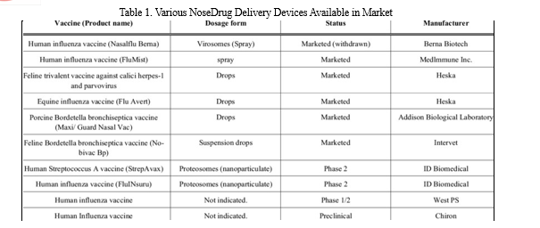 Intranoseadministration is a rapid and safe method not only for the patient but also for the provider to combat emergency situations. However, due to aggressive research in the field of nosedrug delivery, numerous conspicuous merits and features have attracted pharmaceutical industries to design the products as intranosedelivery systems. A few of the marketed and investigational nose to brain targeted productsn are listed in Table 2 and 3 respectively [22, 238, 263].