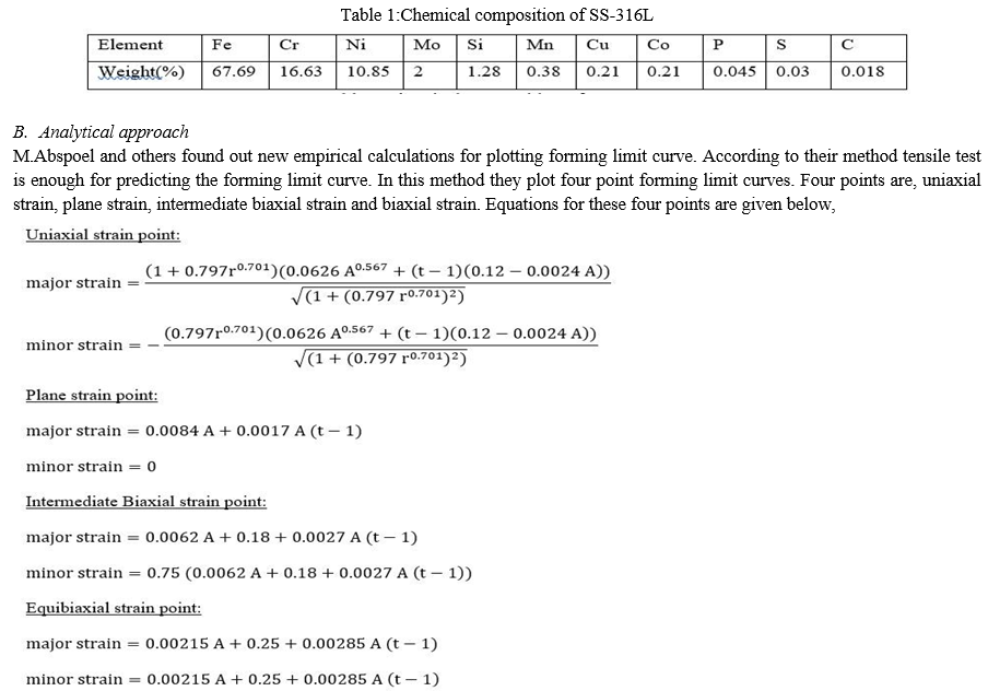 SS-316L is a type of austenitic chromium-nickel stainless steel with higher resistance to corrosion. In comparison with other chromium-nickel austenitic stainless steels, SS-316L contains an excess of molybdenum content which provides it a improved corrosion resistance. 316L grade of stainless steel is until now a majorly used alloy in majority implants sector from cardiovascular, dental, orthopaedic to otorhinology. In orthopaedical sector, appropriate for bone fixing such as plate, screw; and artificial joints because of its potential to substitute the function of hard tissues. It includes electronics, pharmecutical,automotive, and medical implants, that includes pins, screws and orthopedic implants like hip and knee replacements. This research work presents numerical and analytical investigations to develop FLC of 0.05-mm (50 μm) ultra-thin SS316L foil.
