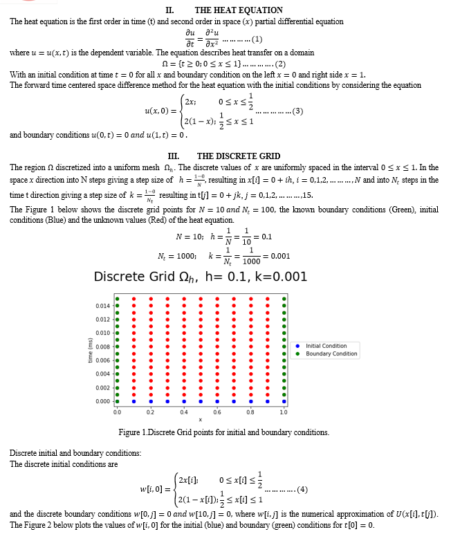 Clint N.Dawson, Qiang DU and Todd F. Dupont have presented a domain decomposition algorithm for numerical solution of heat equation [4]. Abdulla-Al-Mamun et al. have obtained the analytical solution using MATLAB program by considering second order heat equation [5]. Jesus Martin-Vaqueno and Svajunas Sajavicius have demonstrated that the explicit forward time centered space scheme can be stable while some implicit methods such as Crank-Nicolson are unstable [6]. Hooshmandasl M.R., et al. have applied operational matrices of integration to get numerical solution of the one dimensional heat equation with Dirichlet boundary conditions. They have concluded that the use of Chebyshev wavelets is found to be accurate, simple and fast [7]. Tahrich N.A.Shahid et al. have investigated that modified difference equation in specific problems are more convenient for discussing the solution behavior including physical interpretation of accuracy, stability and consistency [8]. Jeffry Kusuma et al. have described a numerical solution for mathematical model of the transport equation in a simple rectangular box domain. Their mathematical model with various advection and diffusion parameters and boundary conditions is also solved numerically using finite difference forward time centered space method [9].