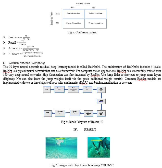 This model is proposed to recognize underwater objects. The model can be used to identify divers, marine life, plastic, and several other objects. Because of its excellent accuracy, fast execution, and efficient performance, the YOLOV2 model is used. Classifying an object into specified classes and isolating it from other objects depending on their locations are both aspects of object localization and object classification. We used non-max suppression to eliminate boxes with the lowest item probabilities and bounding boxes with the highest common area. The intersection over union metric is used in object identification models to evaluate localization accuracy and calculate localization errors.