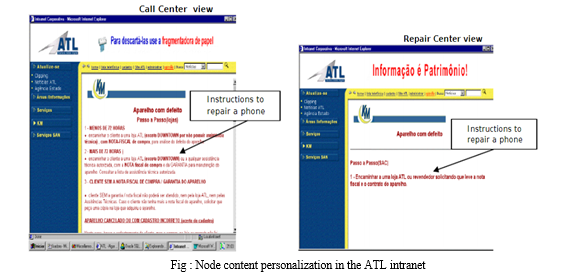 Node content personalization refers to the situation where different users perceive distinct values for the same attribute within a node. This form of personalization is more detailed and specific compared to structure personalization. A prime example can be observed in online stores that offer customers exclusive discounts based on their purchasing history, thereby personalizing the price attribute of the items they see. Intranet applications also provide numerous instances of node content personalization, where the roles and requirements of employees dictate the customization of the information they have access to. For instance, in the intranet of ATL, a mobile phone company in Rio de Janeiro, different sales channels receive tailored information regarding business procedures. When a call center attendant searches for phone repair information, they receive details about the nearest repair center. On the other hand, when a repair center employee performs the same procedure, they receive specific repair instructions for the phone model, as depicted in Figure 5. Designing this type of personalization requires a comprehensive approach right from the start, capturing the personalization rules that are specific to different identified user groups.