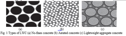 Lightweight concrete (LWC) is a versatile material that has produced a lot of attention and a lot of industrial demand in a variety of construction projects in recent years. LWC kinds are classified based on their production process. These are the types: a) Using lightweight aggregate with a low specific gravity in place of standard weight aggregate, where the specific gravity of the lightweight aggregate is less than 2.6. This form of concrete is commonly referred to as lightweight aggregate concrete. b) concrete or mortar mass incorporated by bubble voids. This type of concrete is known as aerated, cellular, foamed. c) Eliminating the fine aggregate from the mix so the coarse aggregate of ordinary weight is generally used. Thus, known as no fines concrete (Brooks 2010).