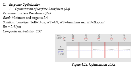 Taguchi Analysis of S/N ratios was used to find the significant factors and ANOVA was used, to determine the statistical significance and percent contribution of these factors on Ra and MRR. Response optimization technique was used to optimise the machining parameters of WEDM. In Taguchi analysis, the lower-the-better solution is chosen for surface roughness and the higher-the-better solution is chosen for MRR, because the target of the current work is to lower the Ra and higher the MRR.