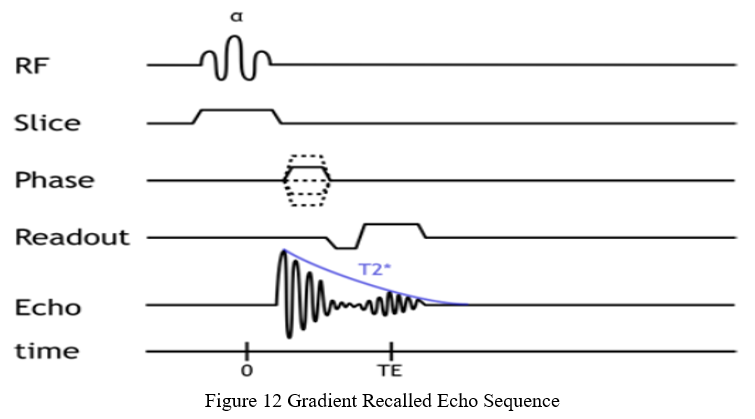 3. Gradient Recalled Echo Sequence: In this type of pulse sequence, no 180-degree refocusing pulse is required (retains T2* dephasing). With the help of gradients spin rephrasing is done. In GRE sequence, an initial α-degree pulse is applied along with slice selection gradient, phase and frequency encoding gradient. Frequency gradient diphase the spins. During the readout phase this frequency gradient is inverted, spin rephrases and an echo is created. It is much faster (not waiting for spin rephrasing after pulse). In this sequence no refocusing pulse is used, it means T2* effects are present. This will result faster FID. For this reason short TEs can be used which on other hand allow shorter TR. In simple word pulse sequence can be repeated more quickly for acquiring more phase-encoding steps.