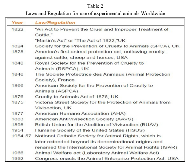The first animal protection law to regulate animal testing was in enacted in 1822 in the British parliament, followed by the Cruelty to Animals Act (1876). The legislation was supported by Charles Darwin, who wrote way back in 1871, “You ask about my opinion on vivisection. I quite agree that it is justifiable for real investigations on physiology; but not for mere damnable and detestable curiosity. It is a subject which makes me sick with horror, so I will not say another word about it, else I shall not sleep tonight”. This led to formation of American Society for the Prevention of Cruelty to Animals (ASPCA) in 1860s, followed by the American Antivivisection Society (AAVS) in 1883 [Table 2]. Under this law, “any procedure can be performed on an animal if it is successfully proven that it is scientifically justified, as specified under the provisions of the Animal Welfare Act and the guide for the care and use of laboratory animals, published by the National Academy of Sciences”. The institution's veterinarian or institutional animal care or institute animal ethics committee (IAEC), for care and use of animals advise the researchers for the use of animals in their respective research projects. These committees have the responsibility to ensure that alternatives, including non-animal alternatives, have been discussed, the experiments are not unnecessarily duplicative and appropriate pain relief is given unless it would interfere with the research.