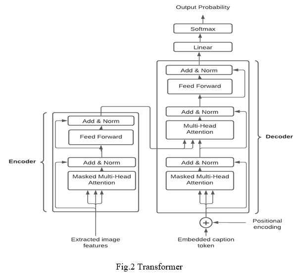 The encoder of transformer takes the image features as input and applies attention mechanism on those image features. Then it is passed to the decoder of the transformer. The tokenized captions are assigned with certain weights based on the semantic meaning and predefined features in embedding layer. For example, a man and a boy are assigned similar weights as they signify similar meaning. Whereas pen and pigeon are assigned very different weights since they are not related. Since, transformer takes the parallel input. It becomes extremely important to maintain the order of each word in captions. The task to keep track of the words in captions is taken care by positional encoding layer.