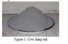 Cow Dung Ash: Cow dung ash has chemical properties wide-range in Nitrogen, Potassium and calcium. It has extremely high carbon to the Nitrogen ratio. While it has physical properties such as it is huge in size, has large ash content and burning ratio is low. Cow dung ash that has been acquire from villages are dried under sunlight, burnt at a temperature of 450 to 500°C and cooled. After cooling it was crushed to powder form, sieved under 300micron sieve was stored in an air tight container preventing moisture ingress. The cow dung is exposed to sunlight to dry in order to have dung cakes which is then subjected to burning after it is drying to have the cow dung ash which is obtained in black colour.