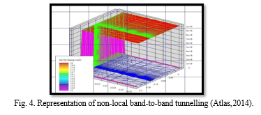 In the band-tunneling model, tunneling current depends on the edge profiling along the entire path between the concentrations which suggests the field developing progressively at all the points in the tunnel and makes the tunneling a non-neighborhood. The net gap recombination rate for band-to-band tunneling by the electric field is shown in Fig. 4. When the positive gate voltage is applied, the dominant mode at the gate-source junction is band-to- band tunneling (BTBT). The non-local band to band electron energy rates at the ON and OFF states are shown Fig. 4. For this structured device, BTBT generation rate increases when the device is ON and finds its maximum value at the source channel junction.