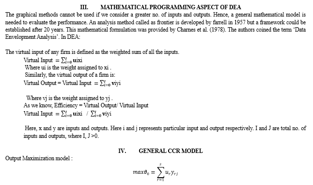 The first introduction of DEA was given by Charnes, Cooper and Rhodes in the year 1978. It is a method of finding the unit’s efficiencies for firms and compare it to the other units to know their relative performances. It is a mathematical programming approach. CCR defines DEA as the programming model which is used for finding the empirical estimates of relations such as production functions that are the chief stones of today’s economics by applying the observational data.