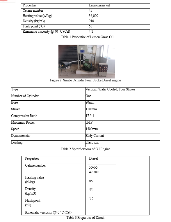 Lemon grass Oil was procured from an oil mill. The oil was filtered to remove the impurities. Diesel fuel was used as baseline fuel. The viscosity was determined at different temperatures using redwood viscometer to find the effect of temperature on the viscosity of lemon grass oil . The viscosity of lemongrass oil was found to be 9 times higher than that of diesel fuel. The flash point of lemon grass Oil was higher than diesel and hence it is safer to store. It is seen that the boiling range of lemon grass oil was different from that of diesel. This lemon grass oil trasnsesterified before blend with diesel because of the oils have glycerol. It must extract from the bio fuel because it will affect the engine performance.