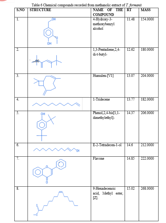 4-Hydroxy 3- methoxybenzyl alcohol (Vanillyl Alcohol) and 9-Hexadecanoic acid, methyl ester are recorded in T. formanni methanol leaf extract. These compounds possess anti-inflammatory, anti-angiogenic, and anti-nociceptive (Ahn et al., 2007; Lim et al., 2008; Jung et al., 2008