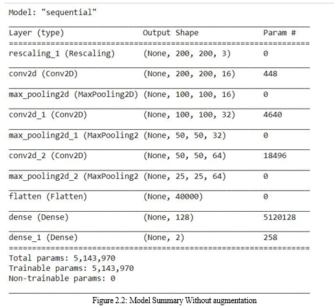 Methodology: Here, we present two CNN architectures- one with a dropout layer and another without a dropout layer. Both CNN consist of convolution layer, max pooling and a classification layer. A series of convolution and max-pooling layers act as a feature extractor that is divided into two parts. The first part consists of two Convolution layers with 32 - 32 units each along with a max-pooling layer of size 3 3 and a Relu activator. While the other also has two Convolution layers but with 64 and 128 units respectively along with a max-pooling layer of size 2 2 and a Relu activator. Relu is a popular activation function which is generally used in neural networks especially in CNNs. Relu layer introduces nonlinearity to the model. Features extracted from the feature extractor part of the CNN are given as input to the dense layer which classifies the image. Before feeding the extracted features to the dense layer, a flatten layer a used. As the dense layer takes 1-Dimensional input, hence, flatten layer flattens the feature data and gives a 1- Dimensional output which is fed to the dense layer. While training a CNN it might be possible that output through a certain layer is more dependent on a few selected neural units. To reduce this dependency and prevent over fitting, the concept of dropout is introduced. During training, in each epoch, a neuron is momentarily dropped with a dropout probability p. Due to this, all the inputs and outputs to this neuron become disabled in the current epoch which results in some loss of data enhancing regularization in the model so that at times it would predict with much higher accuracy. The dropped-out neurons are resampled with probability p at every training step, so a dropped-out neuron at one step may become active in the next step. A dropout probability of 0.5, corresponds to 50% of the neurons being dropped out. In the proposed CNN architecture with dropout layer, we apply dropout at two places. First, it is applied at the feature extractor part i.e. after convolution and max-pool layers. As, the convolutional layers have not too many parameters, hence over fitting is not an issue in this case. Hence, here we take a low drop probability of 0.2. Second, it is used at dense layer. Dropout in the lower layers helps because it provides noisy inputs for the higher fully connected layers which prevents them from over fitting. At dense layers a drop probability of usually 0.5 is used as it has been observed that dense probability of 0.5 gives best regularization in most of the cases. We also use a drop probability of 0.5 here. The model summary of CNN with and without dropout. The architecture of CNN with dropout. The dataset employed in this work is picked from Kaggle. It consists of 5863 images of chest X-ray. The dataset is split into three portions namely training dataset, validation dataset and testing dataset. Initially, the images in the dataset are of varying sizes. However, all the input images given to CNN should be of same size. To solve this problem, all the images in the dataset are resized to 64 64. To avoid over fitting and to enhance the generalization capabilities of the proposed CNN architectures, various in-place data augmentation techniques such as rescaling, flipping etc. are used in this paper. Use of this type of data augmentation ensures that our CNN see new variations of data at each and every epoch during training.