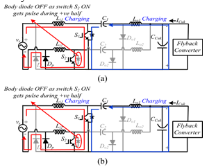 Fig. 8. Operating modes of the proposed converter with same driver signal during the positive half line during (a) switch ON and (b) switch OFF.